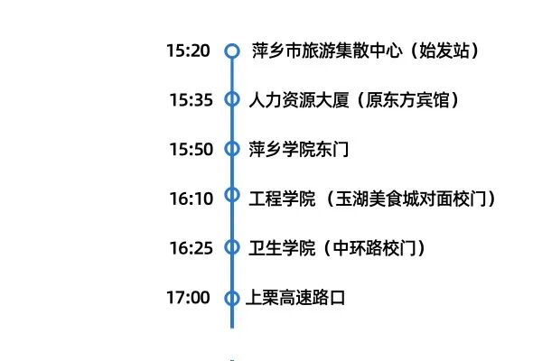 萍乡市区设【市旅游集散中心/人力资源大厦/萍乡学院东门/工程学院/卫生学院/上栗高速路口】六大乘车点,家门口出发超省心!